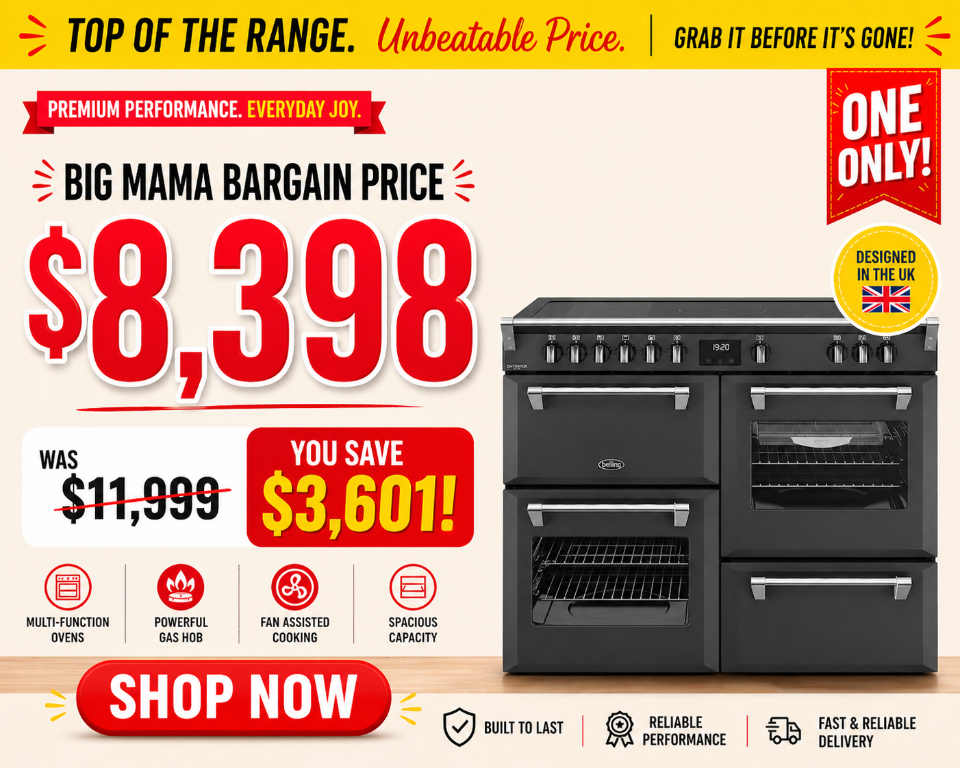 At Big Mama, we make premium appliances affordable. This top-of-the-range Belling oven delivers exceptional quality and performance without the premium price tag.
