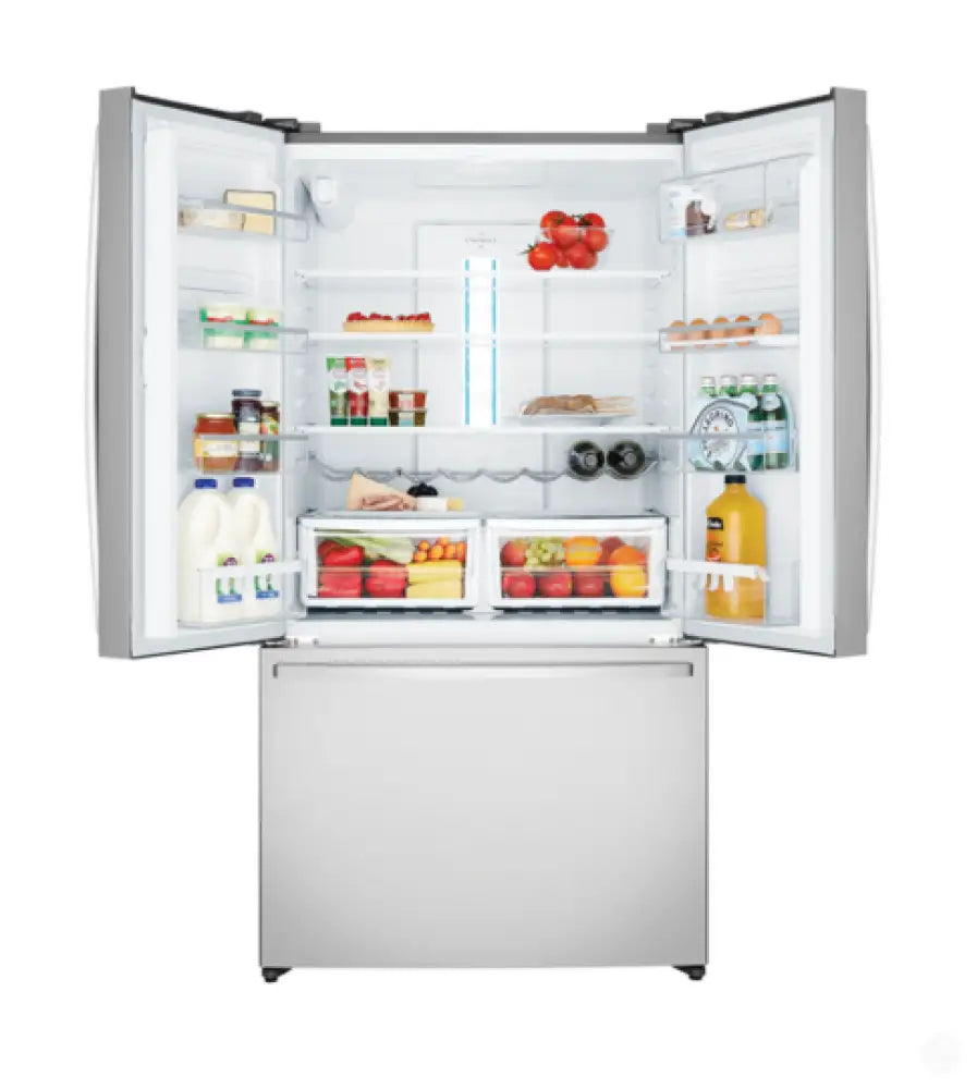 565L french door refrigerator, natural stainless steel with in-door water dispenser, designed to fit inside a 90cm kitchen cavity, with dual sealed crispers with manual humidity control, 4-star energy rating, FlexSpace™ adjustable interiors, FamilySafe Lockable door compartment and Spillsafe™ glass shelving.