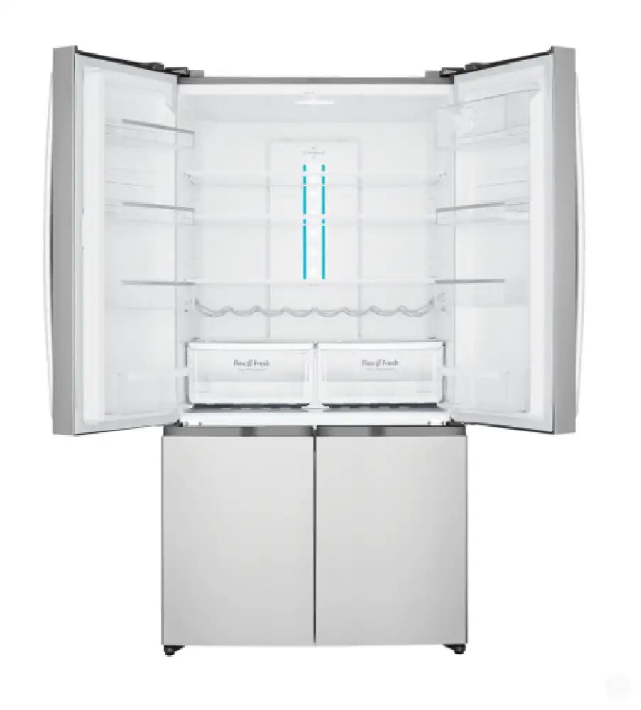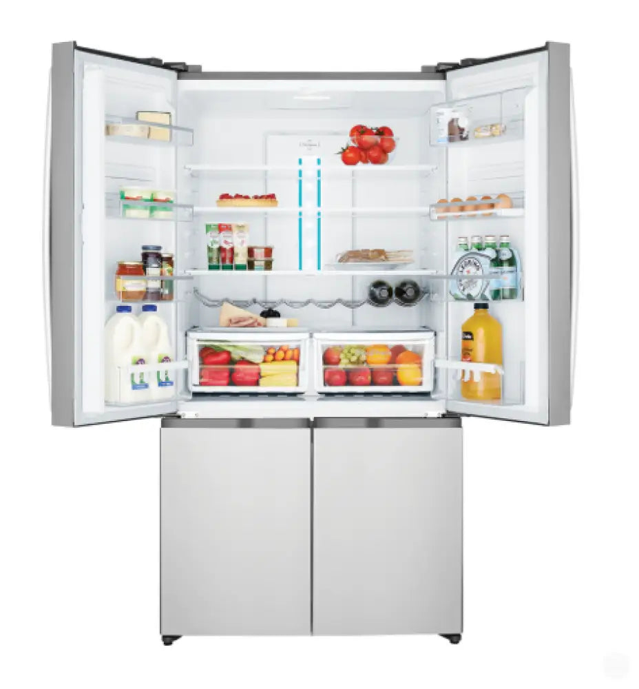 541L quad door fridge, natural stainless steel, designed to fit inside a 90cm kitchen cavity, dual sealed crispers with humidity control, 4-star energy rating, FlexSpace™ adjustable interiors, FamilySafe Lockable door compartment and Spillsafe™ glass shelving.